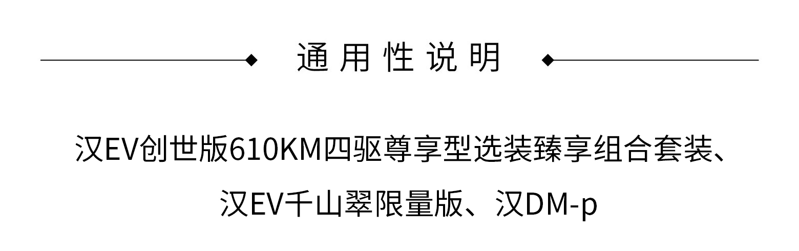 | 安装说明: | 适用于 汉EV创世版610KM四驱尊享型选装臻享组合套装、汉EV千山翠限量版、汉DM-p | |